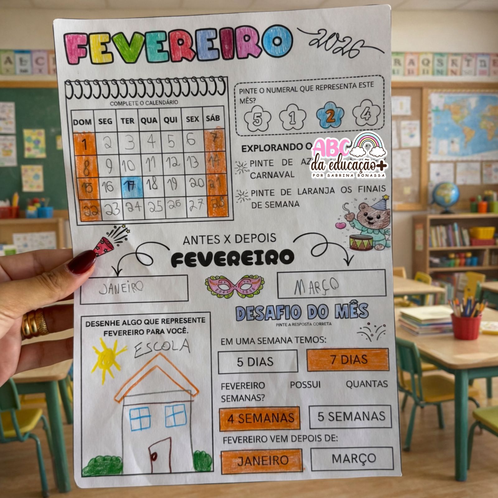 O Calendário Interativo – Fevereiro 2026 foi desenvolvido especialmente para crianças em fase de alfabetização inicial, sendo ideal para o início do ano letivo.
