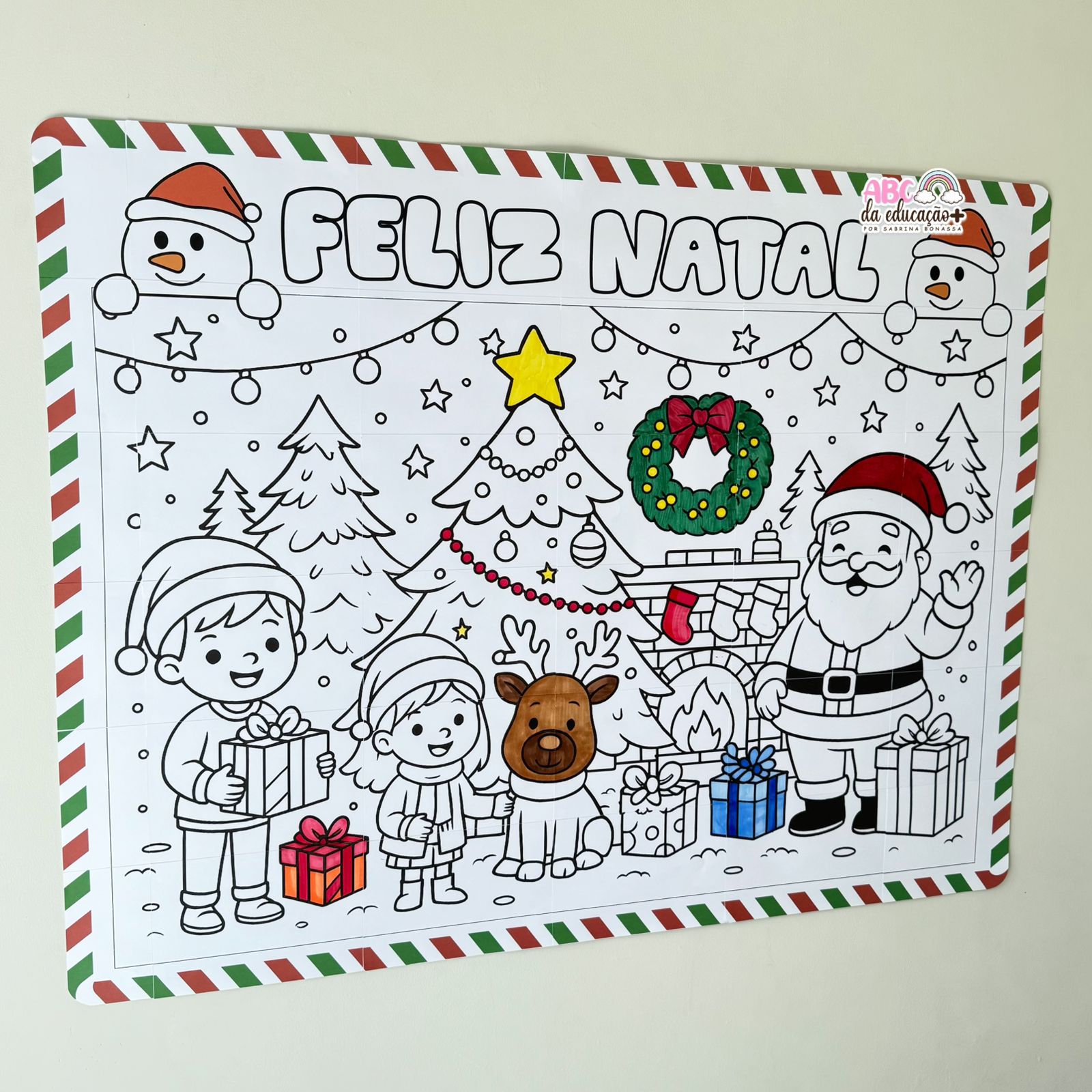 O arquivo acompanha versão ampliada para painel e versão em folha A4, permitindo usar o recurso tanto como atividade artística quanto como decoração interativa. As crianças vão amar colorir cada detalhe: árvore de Natal, presentes, crianças, rena e Papai Noel — tudo no traço suave e encantador do estilo Bobbie Goods.